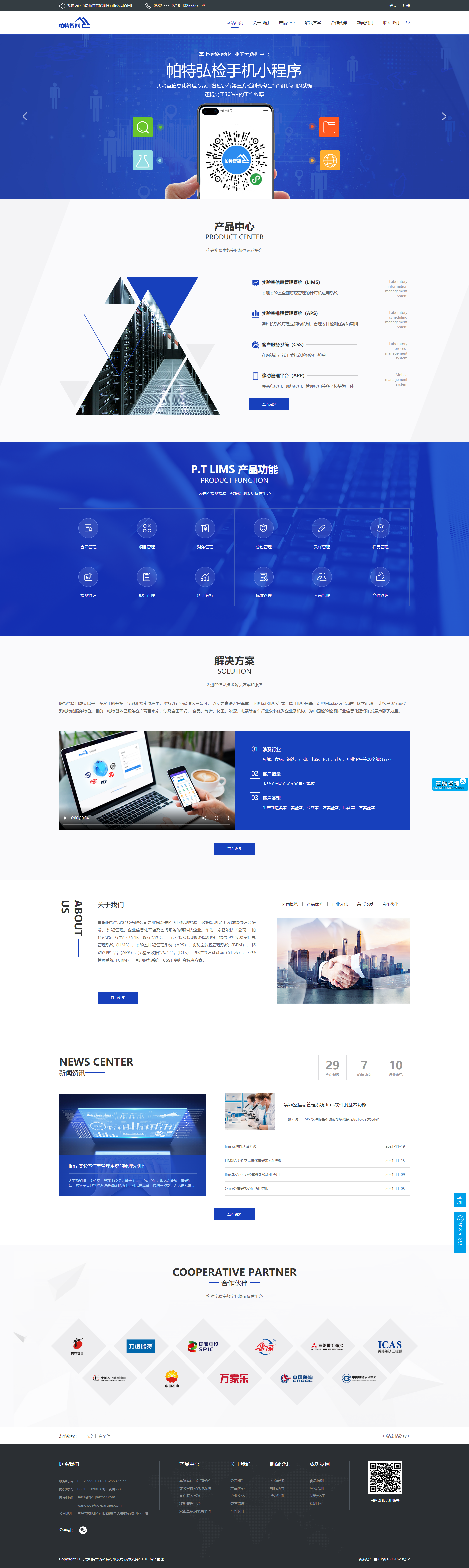 青岛帕特智能科技有限公司是业界领先的面向检测检验、数据监测采集领域提供综合研发、 过程管理、企业信息化平台及咨询服务的高科技企业。作为一家智能技术公司, 帕特智能可为生产型企业、政府监管部门、专业检验检测机构等组织,提供包括实验室信息 管理系统(LIMS),实验室排程管理系统(APS),实验室流程管理系统(BPM), 移动管理平台(APP),实验室数据采集平台(DTS),标准管理系系统(STDS), 业务管理系统(CRM),客户服务系统(CSS)等综合解决方案。